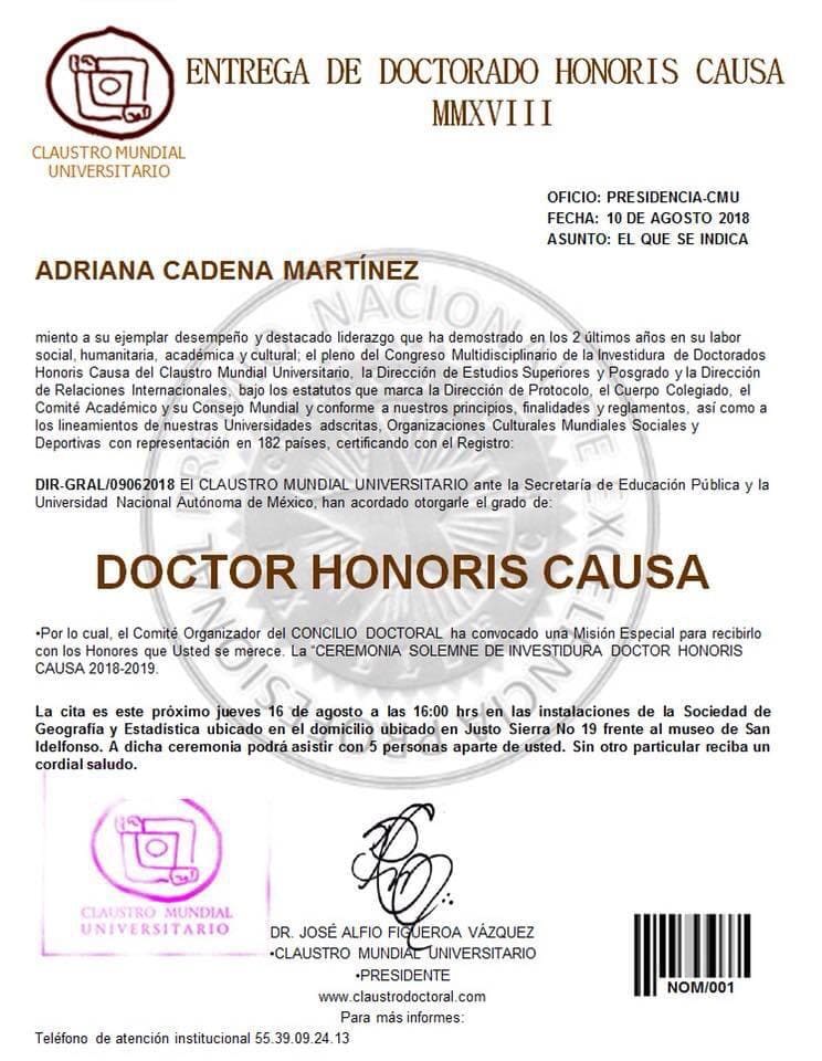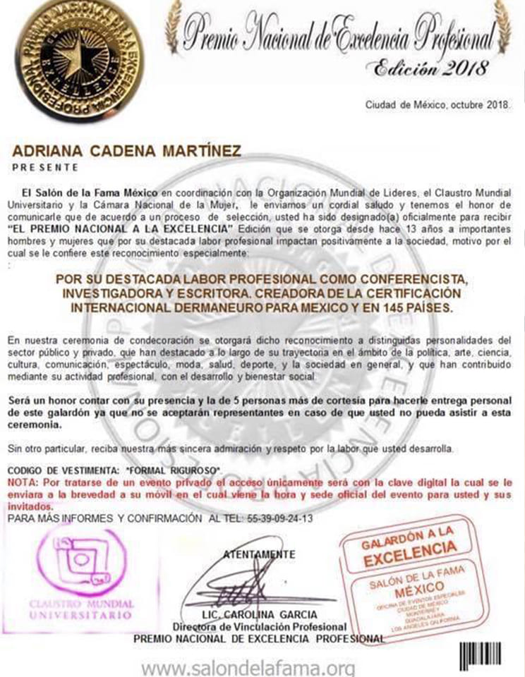 Además de empresaria y emprendedora, Adriana Cadena es creadora de su sistema Dermaneuro® y de la certificación como Master Dermaneuro® en 145 países para la comunidad médica Dermocosmiatría para la comunidad del área del bienestar; también, creó programas de certificación como Master Coach Wellness y Sex Coach Healthy.